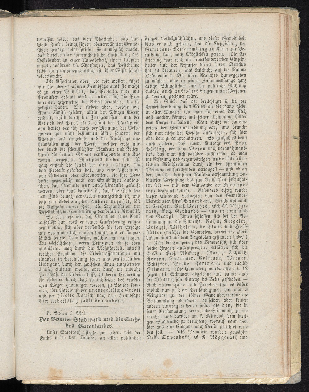 Ein Glück, daß der berüchtigte § 61 der Gemeindeordnung das Mittel an die Hand giebt, in allen Dingen, wo man sich etwa den Pelz naß machen könnte , mit seiner Gesinnung hinter dem Berg zu halten ! Man schützt die Incompetenz der Gemeindeordnung vor, und braucht sich nun nicht der Gefahr auszusetzen, sich hier oder dort zu compromittiren. So geschah es denn auch gestern, daß einem Antrag des Prof. Böcking, der dem Wesen nach darauf hinauslief, daß man sich darüber ausspreche; ob man die Ersetzung des gegenwärtigen unvolksthümlichen Ministeriums durch ein der öffentlichen Meinung entsprechendes verlange ? – und ob an der, von der deutschen Nationalversammlung publicirten Verfassung bis zum Aueßersten festzuhalten sei ? - mit dem Einwand der Incompetenz begegnet wurde. Besonders eifrig wurde dieser Einwand verfochten von den Gemeinde = Verordneten Prof. Bauerband, Berghauptmann v. Dechen, Prof. Perthes, Geh-R. Röggerrath, Beig. Gerhards – und in etwa auch von Georgi. Ihnen schlossen sich bei der Abstimmung an die Stdtrthe: Cahn, Riegeler, Petazzi, Wilhelmn, de Claer und Hoffstätter ( welcher die Competenz verneinte, „ weil davon nichts auf dem Tagesblatt gestanden habe.“ )