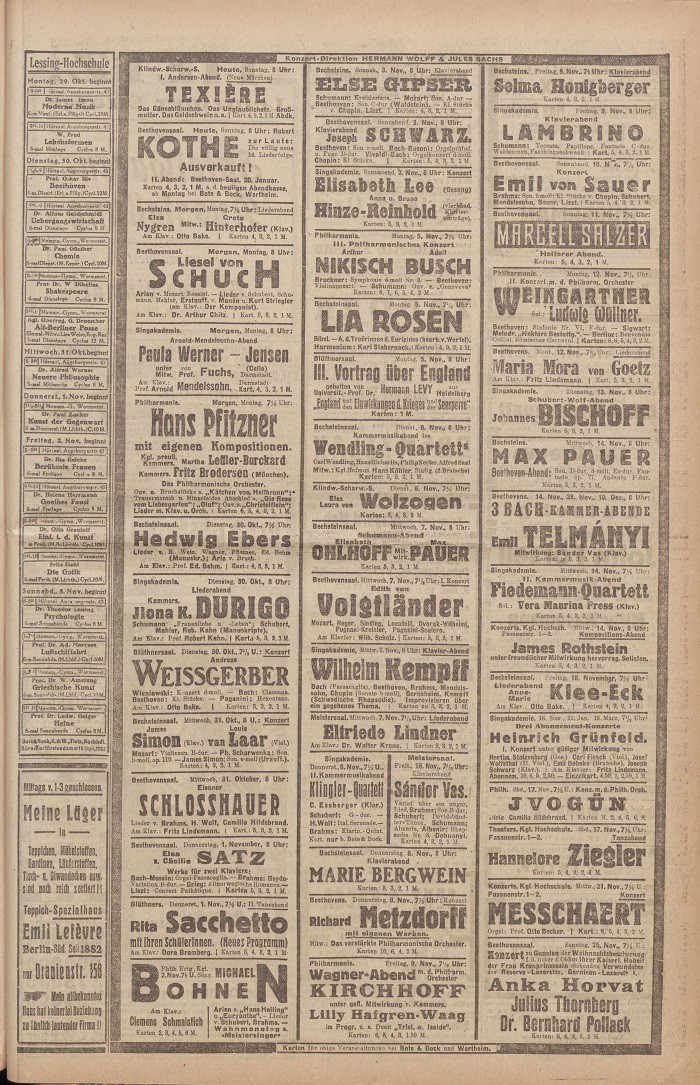 Die Erstaufführung von Korngolds „Violanta“ und „Ring des Polykrates“ findet im Königlichen Opernhaus am 2. November statt. In „Violanta“ sind in den Hauptrollen die Damen Hasgren-Waag, Goetze und die Herren Hutt und Armster, im „Ring des Polykrates“ die Damen Dux, Engell und die Herren Bergman, Henke und Stock beschäftigt. Musikalische Leitung: Generalmusikdirektor Blech, Regie: Dr. Bruck. Der Komponist ist eingetroffen und wird der Erstaufführung beiwohnen.
